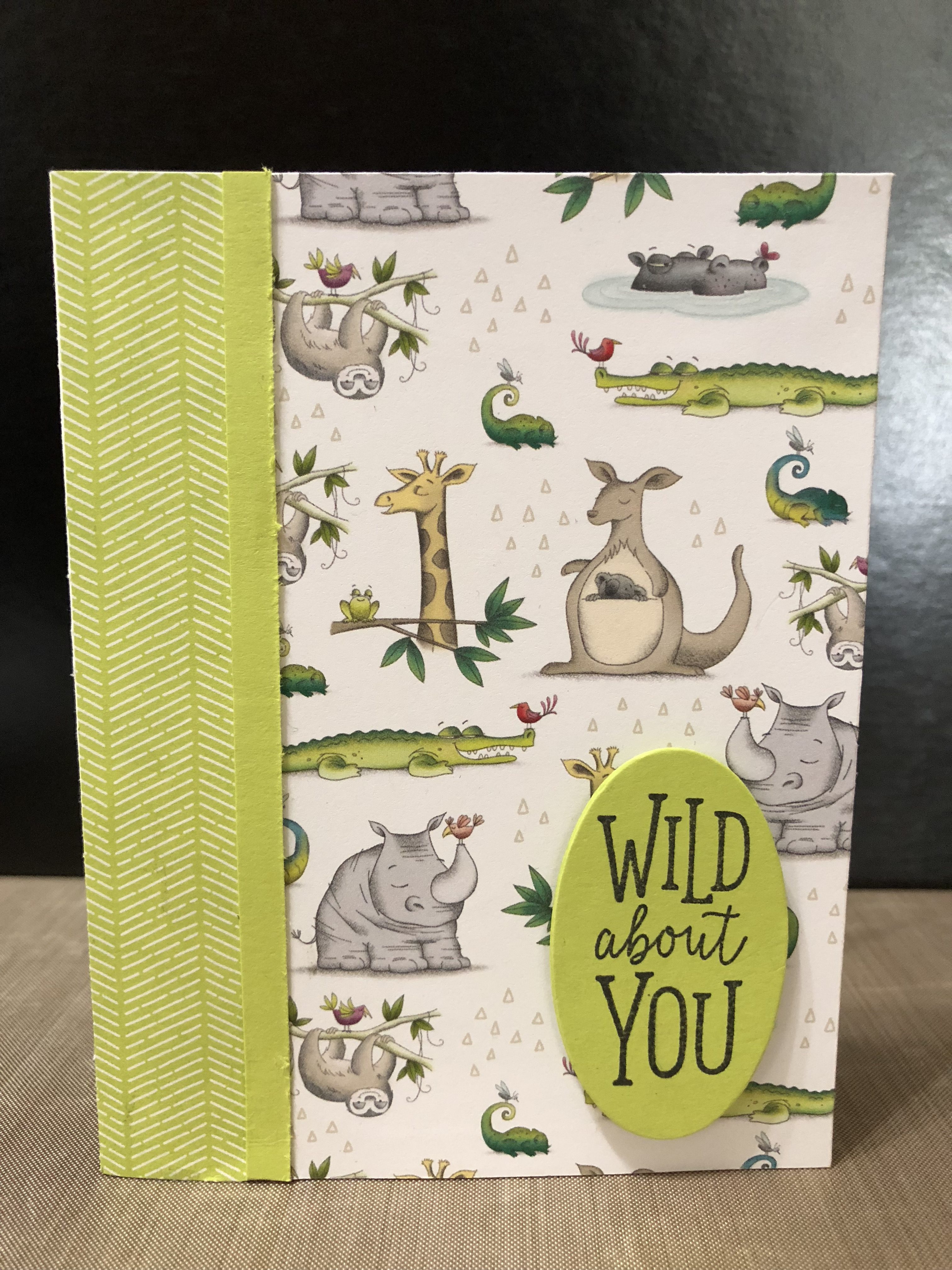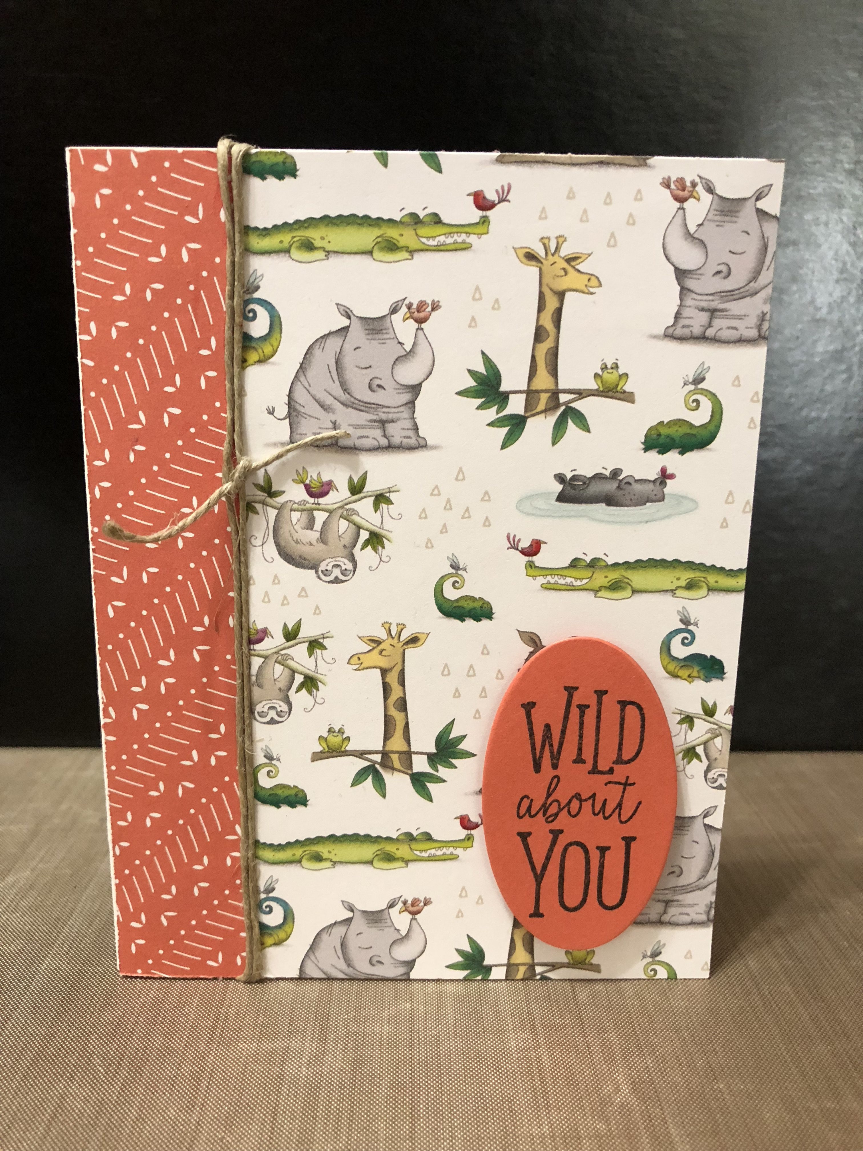 For today’s card I used the Animal Outing stamp set and Animal Expedition Designer Series Paper (aka DSP) to create the cards below. For the 1st card I cut a piece of 4 1/4 x 5 1/2 inch piece of DSP and then cut 1 inch off of the 5 1/2 side to use the Calypso Coral side on back and glued both pieces onto thick Whisper White card stock. I was going to make 2 of the same card  but I glued the wrong side of the one inch piece for the 2nd card ( that’s why you see the DSP in Granny Apple Green on the second card) . So then I cut a 1/4 x 5 1/2 inch Granny Apple Green card stock and glued it down between the 2 DSP’s. I also used some retired, old hemp ribbon I found in my stash.