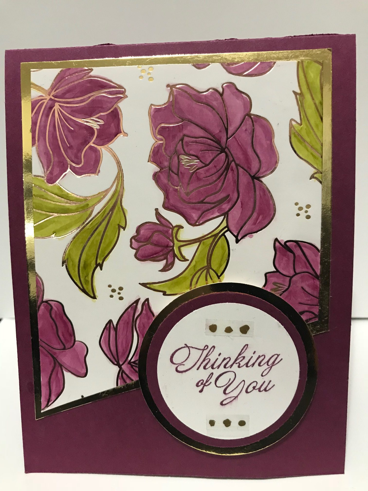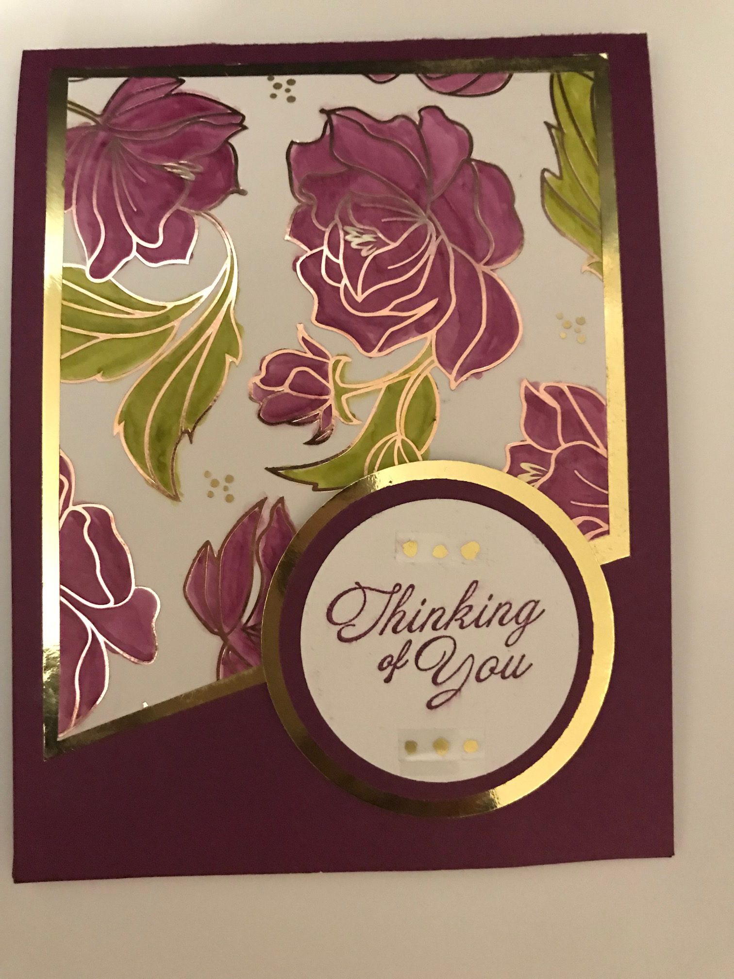 I did my first EVER card challenge. I don’t know why I haven’t done these before, it was so much fun. For this challenge I did the Springtime Foil sheets again. I just love using the Stampin’ Blends on these sheets. I also used the Painted Love Gold Vinyl Stickers (the dots above and below the Thinking of You stamped image). Here is the card at slightly 2 different angles. I used Color Lifter marker on the gold outlines to make the images pop. This card looks much better in person, the pictures don’t do the card justice (I should probably take a photography class).